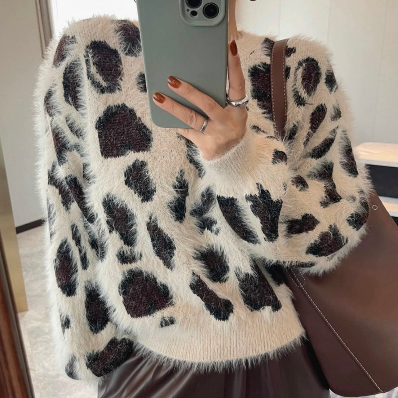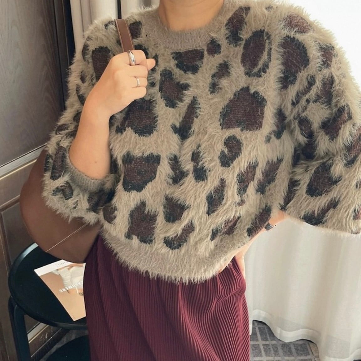 大きめなレオパード柄とシャギーが可愛いニットです。