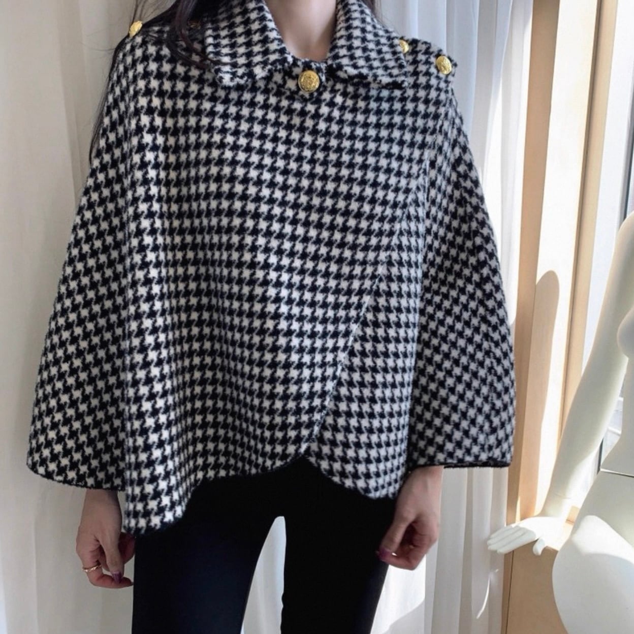 ゴールドボタンがアクセントになるポンチョ。