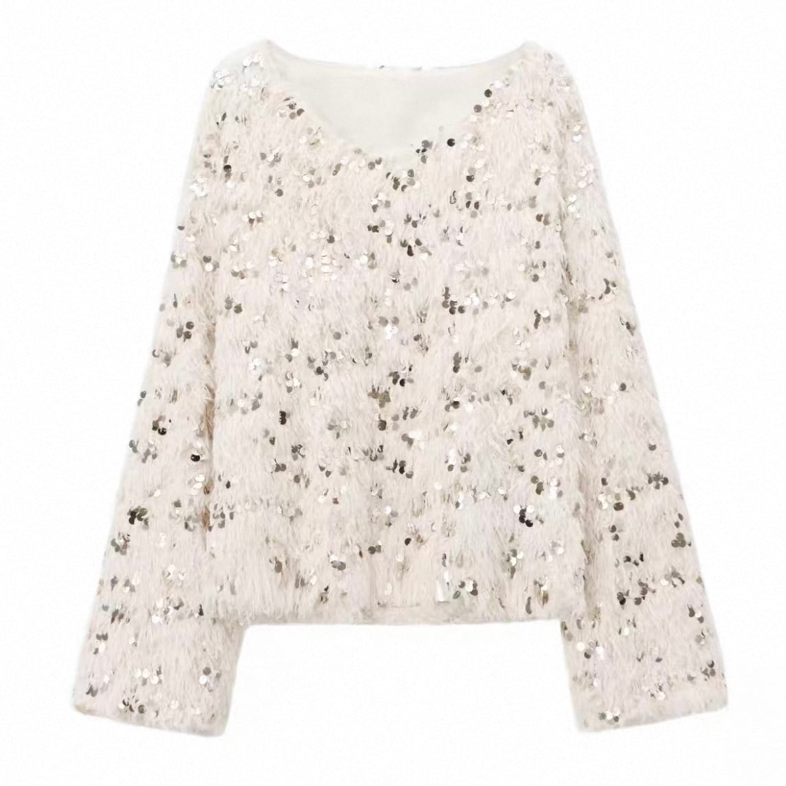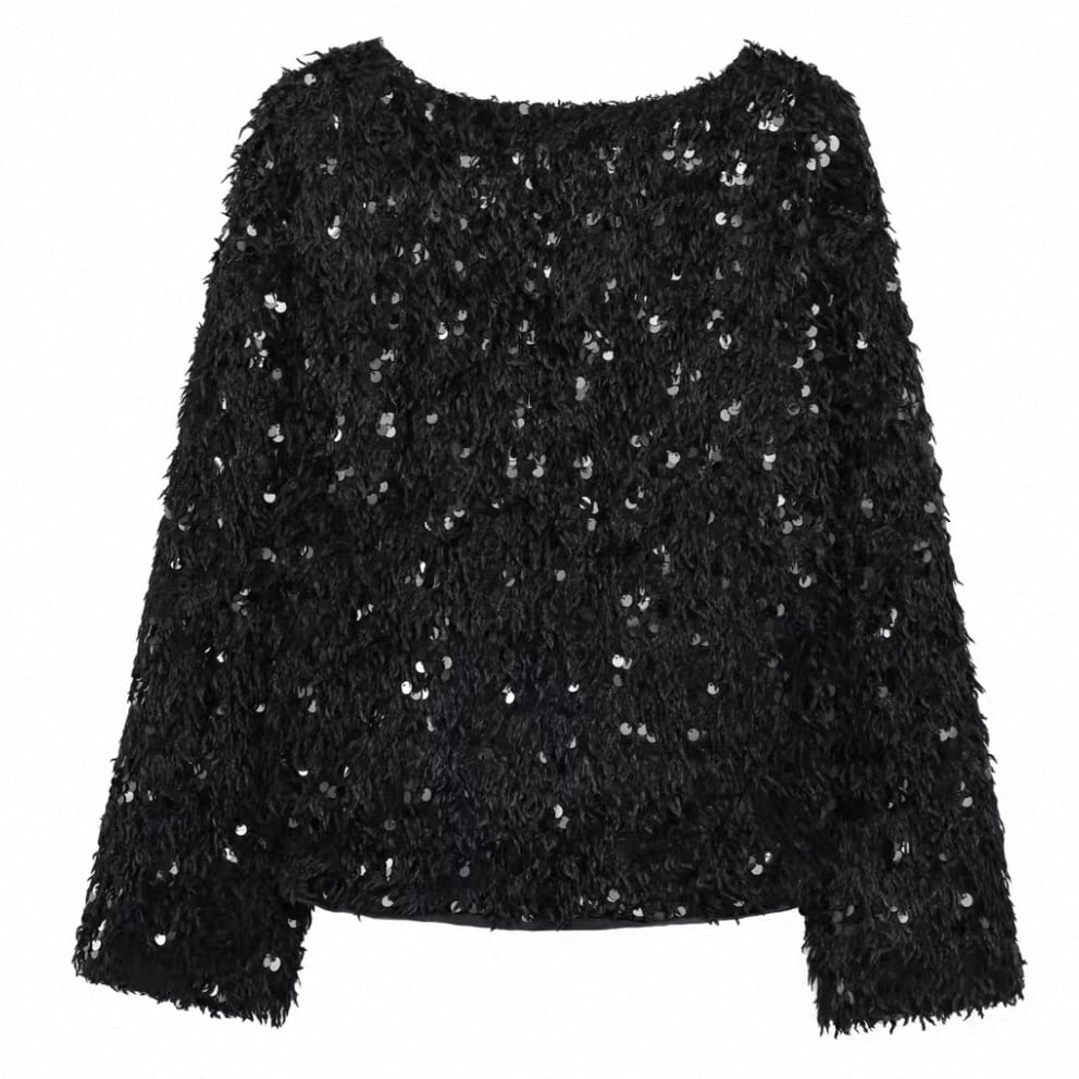 きらきらスパンコールとフェザー生地が可愛いトップス。