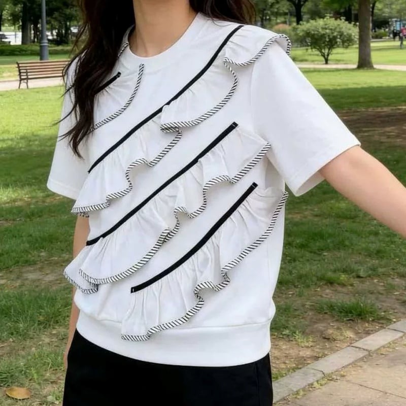 大胆に施された斜めのフリルが、アーティスティックな表情を見せる一着。