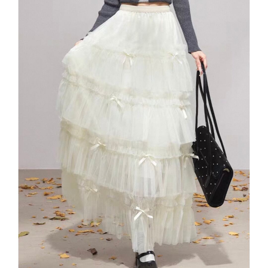 幾重にも重なるチュールフリルと小さなリボンの組み合わせが可愛いロングスカートです。