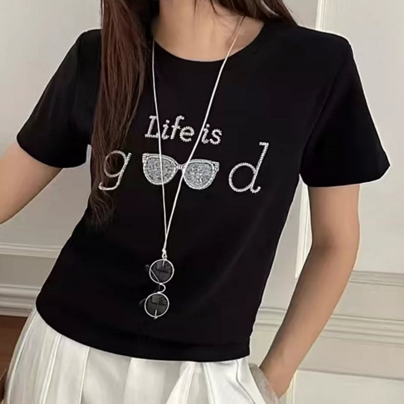 きらめくサングラスデザインが印象的なスタイリッシュTシャツ。