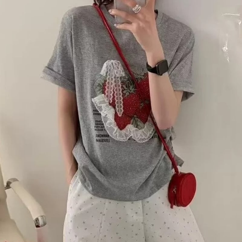 ヴィンテージライクなストロベリープリントに、立体的なレースを贅沢にあしらった主役級の一着。