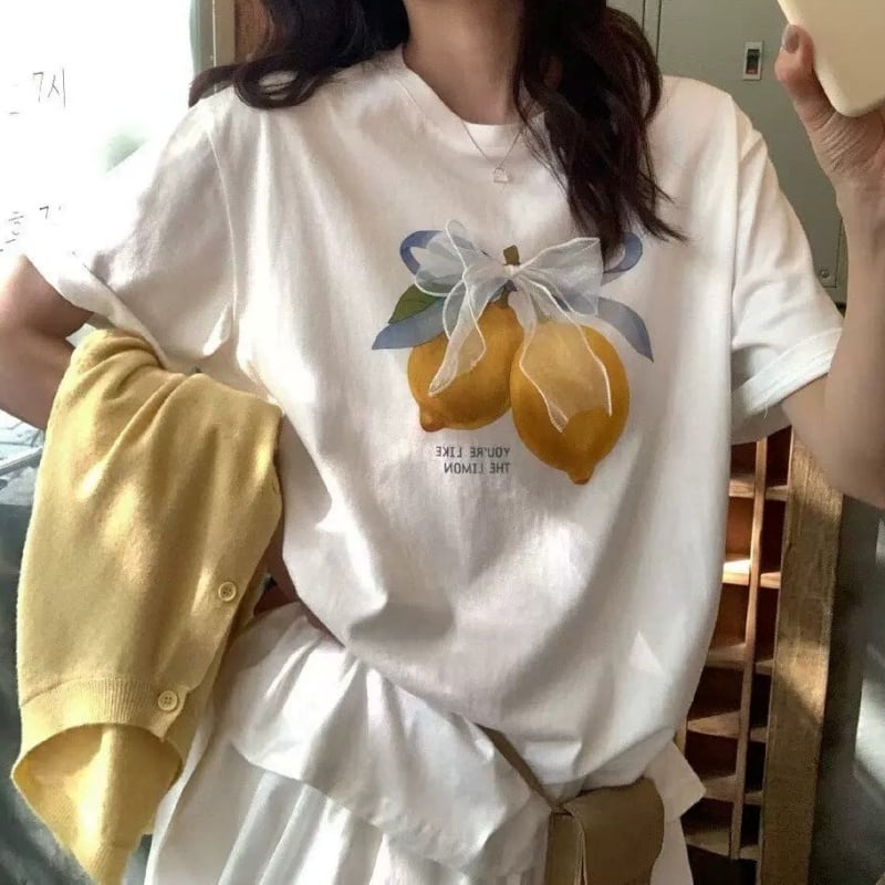 遊び心のあるレモン柄に、チュールの透け感が美しいリボンを添えたフェミニンな一着。