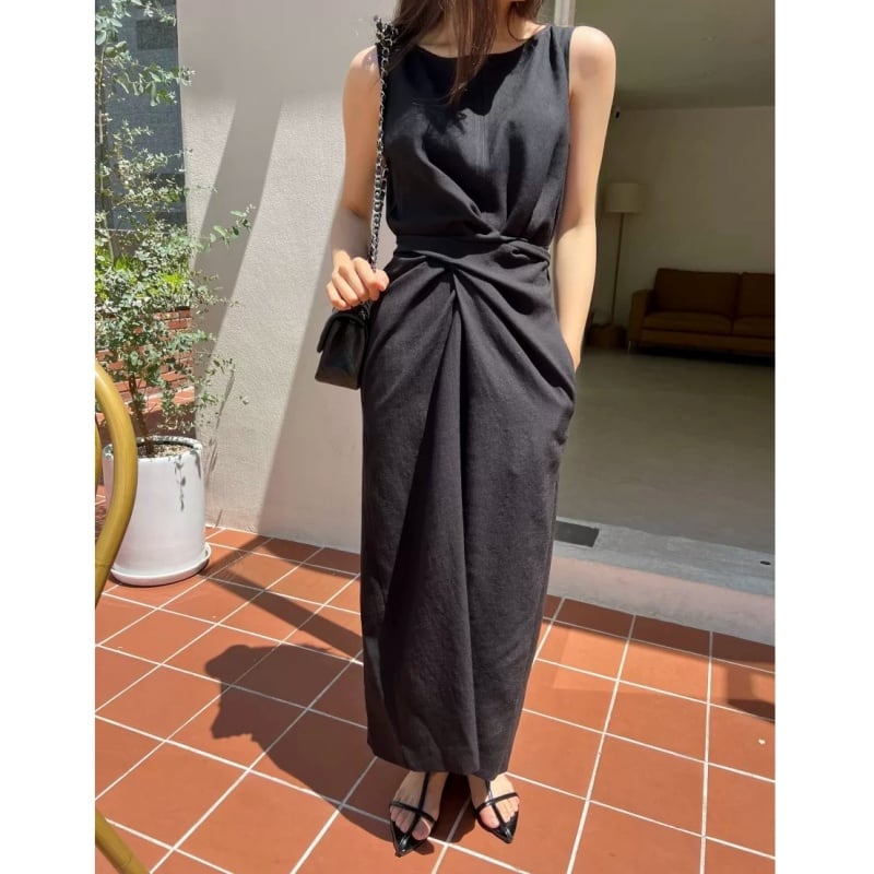 ウエストのツイストデザインが、洗練されたメリハリを作るロングワンピース。