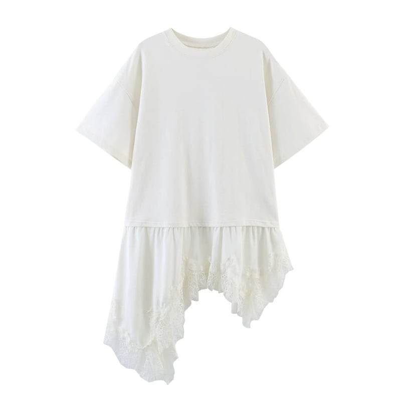 大胆なアシンメトリーラインに繊細なレースをあしらった印象的な一着。