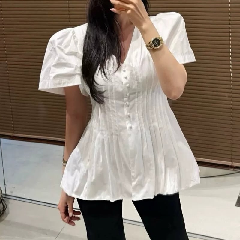 ボリューム感のあるパフスリーブとVネックのラインが、顔周りをすっきりと見せるブラウス。