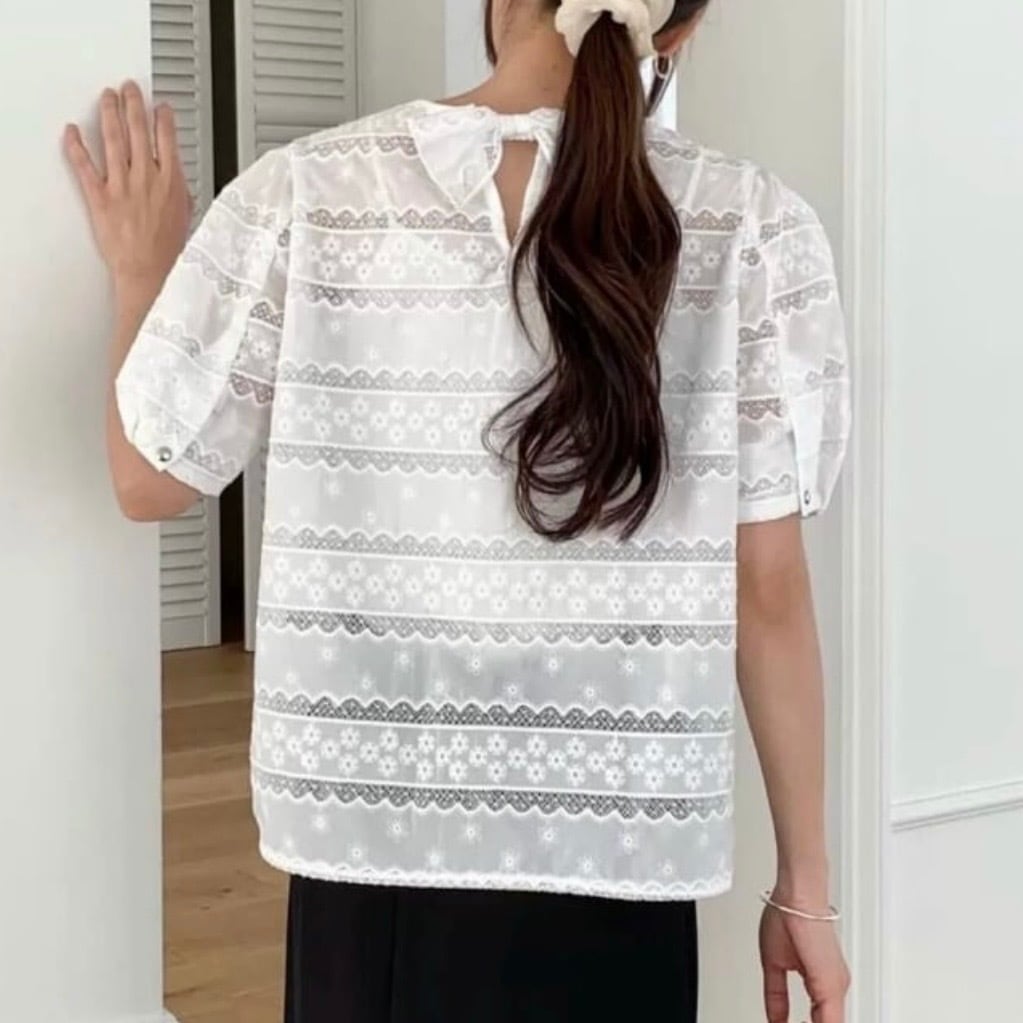 背面に配されたリボンが、大人の可愛らしさを品よく演出するブラウス。