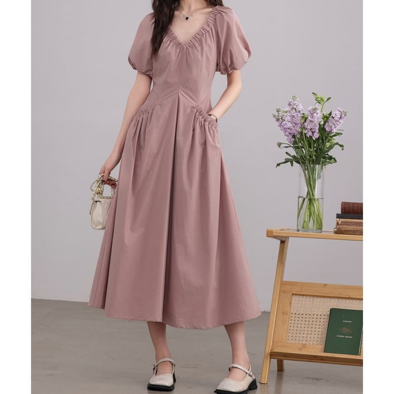 やわらかな印象のパフスリーブギャザーフレアロングワンピースです。